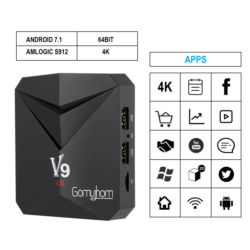 - Product name : GOMYHOM TV Box Android 7.1 V9 Smart Box Amlogic S912 Octa Core 3GB RAM 32GB ROM H.265 3D 4K HD 2.4G